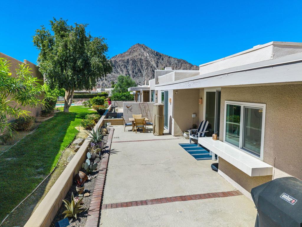 Whether pursuing the lifestyle you deserve or searching for a low-maintenance showplace, this impressively upgraded home is ready for move-in. A coveted corner homesite beyond the guarded entry gates of La Quinta's Laguna de la Paz enclave sets the stage for premium desert living in a virtually custom residence. Every detail has received exceptional attention in the single-level design, where three bedrooms and two baths are featured in approximately 1,730 square feet. Crisp, white tongue-and-groove ceilings crown living areas that include a formal entry and a large family room with patio access, upgraded fireplace, high-ceiling with clerestory windows, and a wet bar with under-cabinet refrigerator. Enjoy entertaining in dining room that transitions directly to a chic remodeled kitchen with custom flat-panel, high-gloss frameless cabinetry. Quartz countertops complement a tile backsplash that reaches the ceiling, an island with seating and ample storage, a glass door to the back patio, and stainless steel appliances including a dual-oven range with sleek hood. Open and enriched with gorgeous natural light, the free-flowing design's bedrooms feature direct access to the outdoors, with one opening to a private atrium. Skylights, custom vanities and upgraded tile surrounds elevate on-trend style in both baths. Relax stylishly in the primary suite, where direct backyard access, two sinks, a generous walk-in closet and dual-head shower are featured. The list of impressive upgrades continues with wide-plank luxury vinyl flooring, custom paint and window treatments, elegant crown molding, and high-end ceiling fans and lighting fixtures. An attached two-car garage offers direct access, and new interior and exterior furnishings are available. Newer AC, redesigned landscaping and irrigation, a newer water heater, and upgraded vinyl-clad energy-efficient windows and doors are included. Mountain and pool views provide a scenic backdrop for entertaining in the large wraparound backyard patio. Close to luxurious resorts, golf courses, Old Town La Quinta and Palm Desert, Laguna de La Paz provides residents with exclusive access to a clubhouse, 15 pools, 16 spas, boating on a five-acre lake, trails, and tennis and pickleball courts. Golf courses, shopping centers, restaurants and Old Town La Quinta are merely minutes away from this impeccably upgraded townhome.