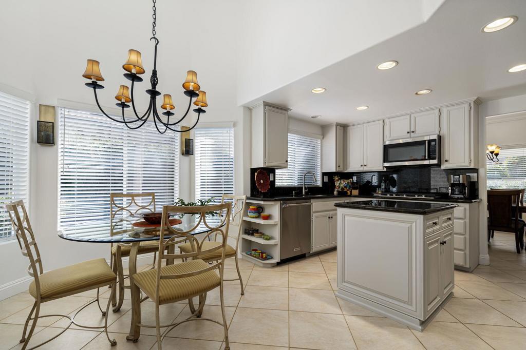 Backing to a beautiful greenbelt and surrounded by up-close views of the Santa Rosa Mountains, this elegantly upgraded La Quinta home presents an outstanding turnkey opportunity. Offering a quiet setting near the back of guard-gated Laguna de la Paz, the single-level residence is a brief stroll from the community pools and spas. Professionally maintained and manicured landscaping elevates grounds that features a gated side entrance and a backyard with large covered patio for the ultimate in outdoor relaxation and socializing. Entertaining indoors is exceptional as well thanks to an open floorplan that measures approximately 1,852 square feet. A formal entry flows directly to three bedrooms, two baths, and a generously proportioned living room that displays an upgraded stacked-stone fireplace, patio access, and a mirrored wet bar with under-cabinet beverage refrigerator. Natural light illuminates an open-concept kitchen with island, white cabinetry including a built-in pantry, granite countertops with full backsplash, upgraded stainless steel KitchenAid appliances, and a casual dining nook with extra-high ceiling and bay window. Custom recessed art lighting, tile flooring, high-end carpet in bedrooms, mirrored wardrobe doors, and custom crown and base molding lend an air of distinction throughout. Opening to the patio, the primary suite is a private sanctuary that reveals a walk-in closet with custom built-in organizers and drawers, two sinks, a soaking tub and separate shower. A convenient laundry room with cabinetry leads to an attached two-car garage. Centered around a shimmering five-acre lake that offers paddle and pontoon boats and catch-and-release fishing, Laguna de la Paz is a true desert oasis. Residents enjoy a luxurious clubhouse, 15 pools, 16 spas, a 24-hour fitness center, scenic trails, and tennis and pickleball courts. Golf courses, shopping centers, restaurants and Old Town La Quinta are minutes away.