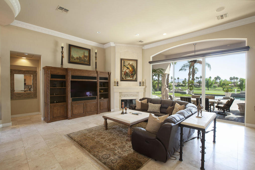 Motivated seller! Located on a prime interior cul-de-sac street, this popular Montana 1 floorplan offers sweeping lake, mountain & double fairway views across the Pate Course. Accessed through a private courtyard entry w/fountain, guests are greeted by custom wood entry doors and once inside, massive Fleetwood sliders frame views of the covered outdoor living area, fire pit, pool, water spillways and lake beyond. Our popular greatroom floorplan, this home offers a spacious family room as the main hub from which you'll find a large formal dining area, light& bright morning room and the chef's kitchen that's complete w/rich granite counters, spacious granite center island, stainless steel GE Monogram industrial grade appliances & a walk-in pantry.The family room offers automated electronic shades, travertine flooring, a large entertainment center, romantic fireplace, crown moulding ceiling detail & incredible views of the rear grounds.The main bedroom suite offers a fireplace and direct access to the pool and infinity edge spa. Steps away, a main bath is complete with large mitered glass entry shower, dual sinks, jetted tub, rich marble counters, private commode and a grand walk-in closet with custom organizers. The 4th bedroom is satisfied by the gorgeous guest house w/ travertine flooring & spacious bath with walk-in closet. Poolside, you find a custom BBQ cooking station, fire pit, raised spa, meandering spillway, pebbletec salt-water pool & raised water spillway. Furnished.